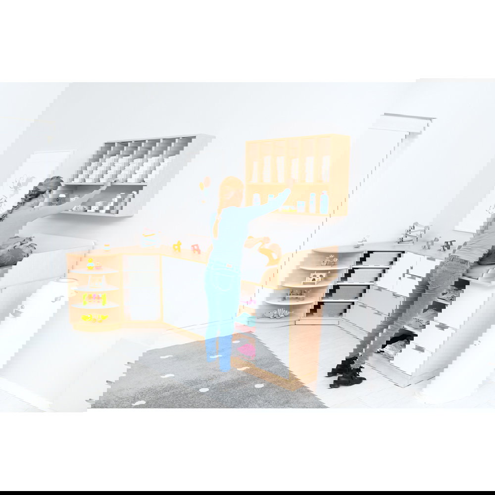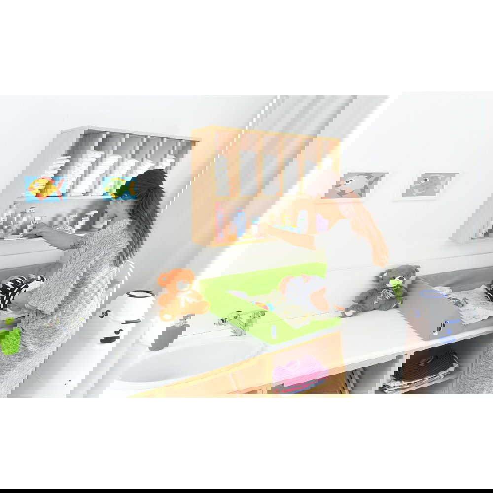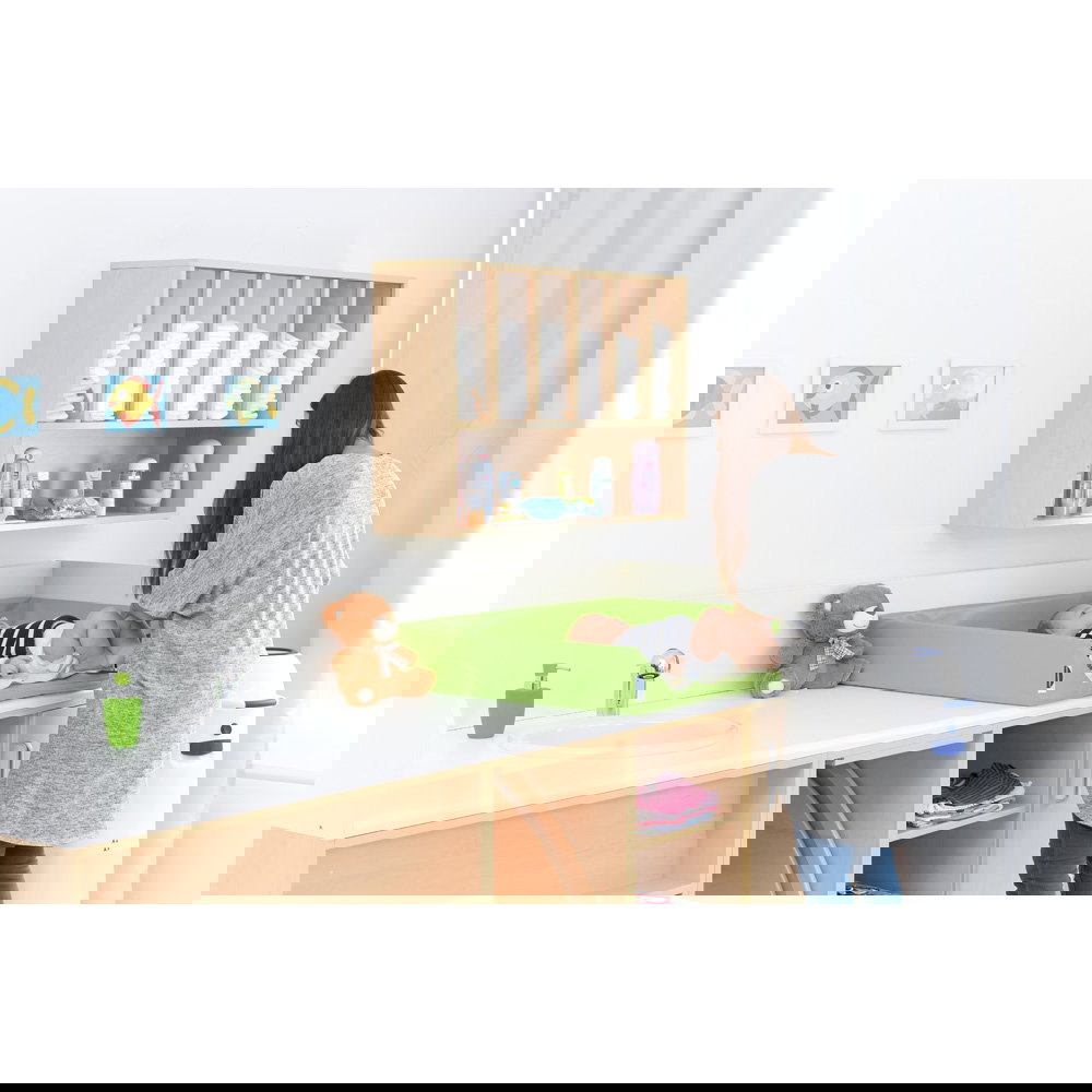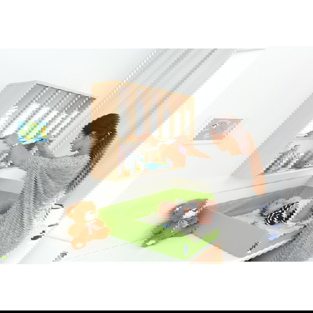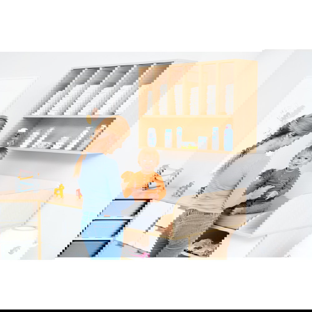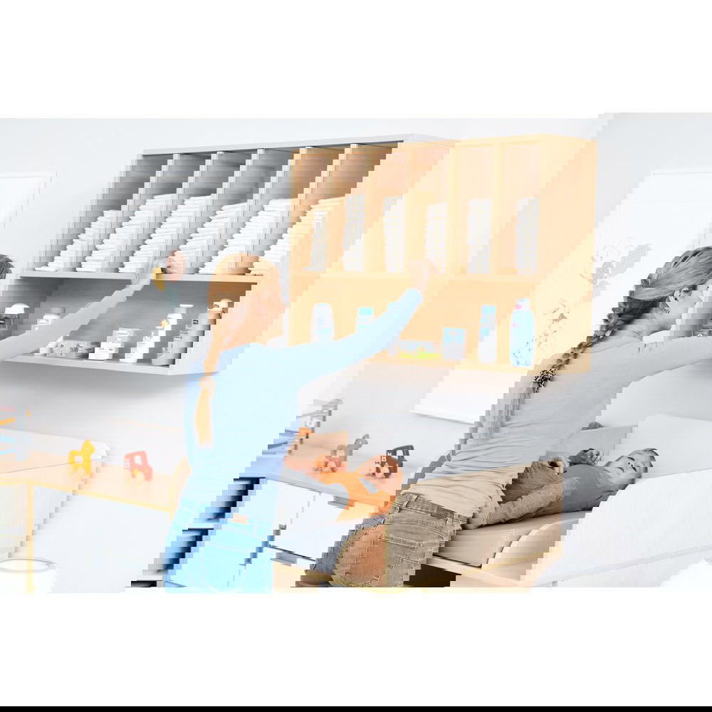 Der größte Vorteil der Wandmontage ist die Ergonomie. Windeln und Pflegeutensilien befinden sich genau dort, wo sie gebraucht werden: auf Augen- und Griffhöhe. Sie müssen sich nicht bücken, keine Schubladen öffnen und sich nicht vom Kind abwenden. Ein Handgriff genügt, und Sie haben die frische Windel parat – so bleibt die volle Aufmerksamkeit beim Kind. - Maximale Raumnutzung und freie Arbeitsflächen