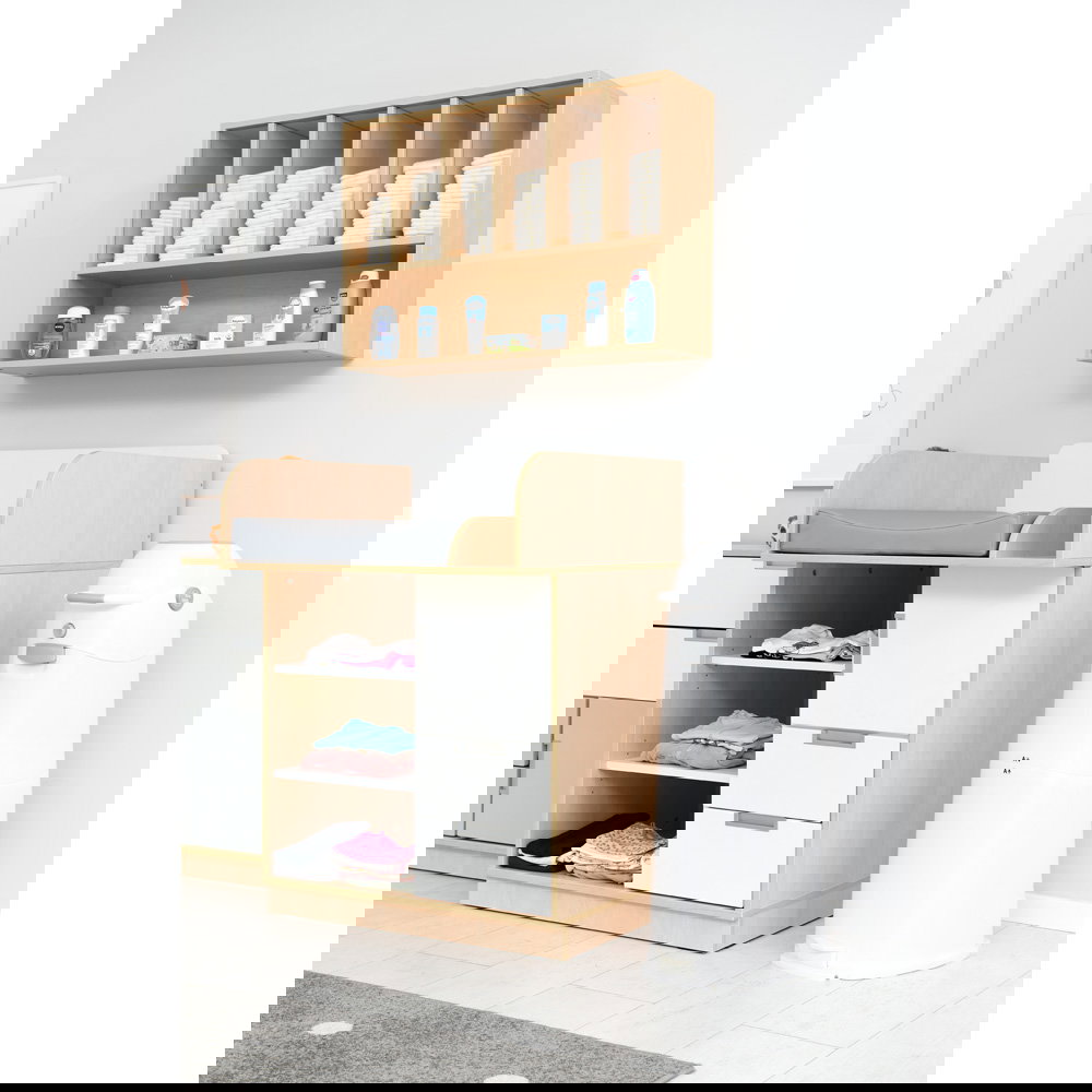 Dieses durchdachte Wandregal nutzt den oft verschenkten Raum an der Wand effizient aus und schafft wertvollen Platz auf der Arbeitsfläche. Es wurde speziell konzipiert, um Windeln übersichtlich, griffbereit und hygienisch aufzubewahren. Erhältlich in zwei Varianten – als kompaktes Basismodell oder als erweiterte Version mit zusätzlichem Ablagefach – passt es sich flexibel Ihren individuellen Raumbedingungen und Stauraumbedürfnissen an. Das freundliche Ahorn-Dekor fügt sich dabei harmonisch in jede Einrichtung ein und sorgt für eine warme, aufgeräumte Atmosphäre.