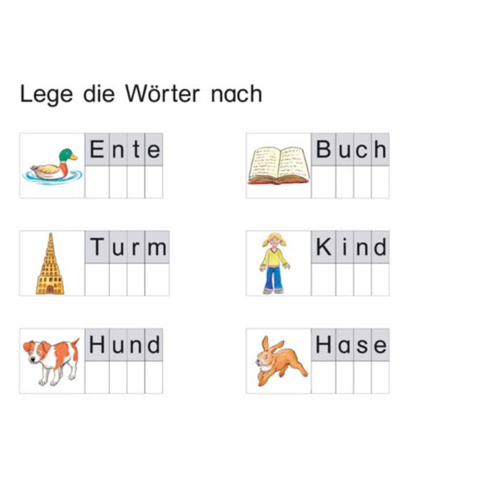 - Bebilderte Wörter nachlegen: Kinder können Wörter mit den passenden Buchstaben legen, die den Bildern zugeordnet werden.