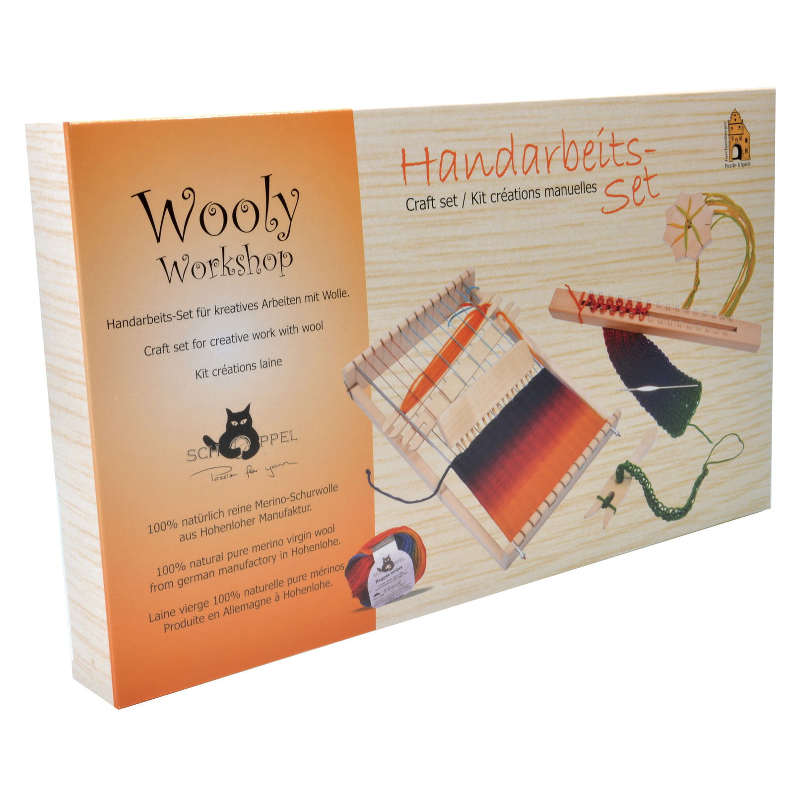 Das Wooly Workshop Handarbeitsset für Kinder & Anfänger. Enthält Webrahmen, Strickstab, Knüpfstern & Strickgabel inkl. Merinowolle. 4 Techniken in 1 Box