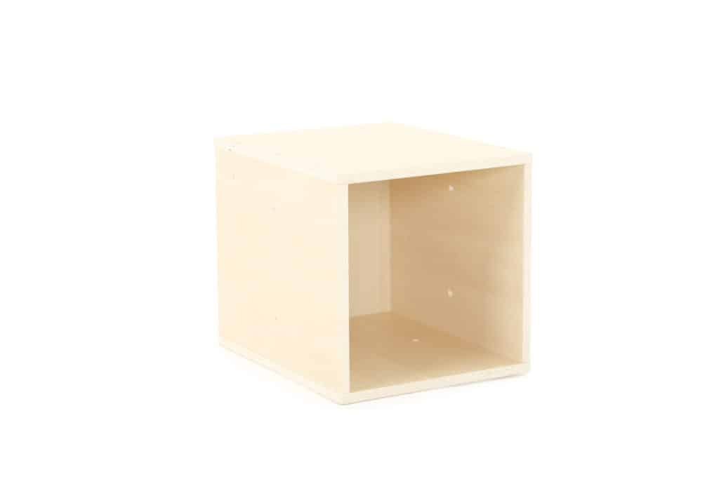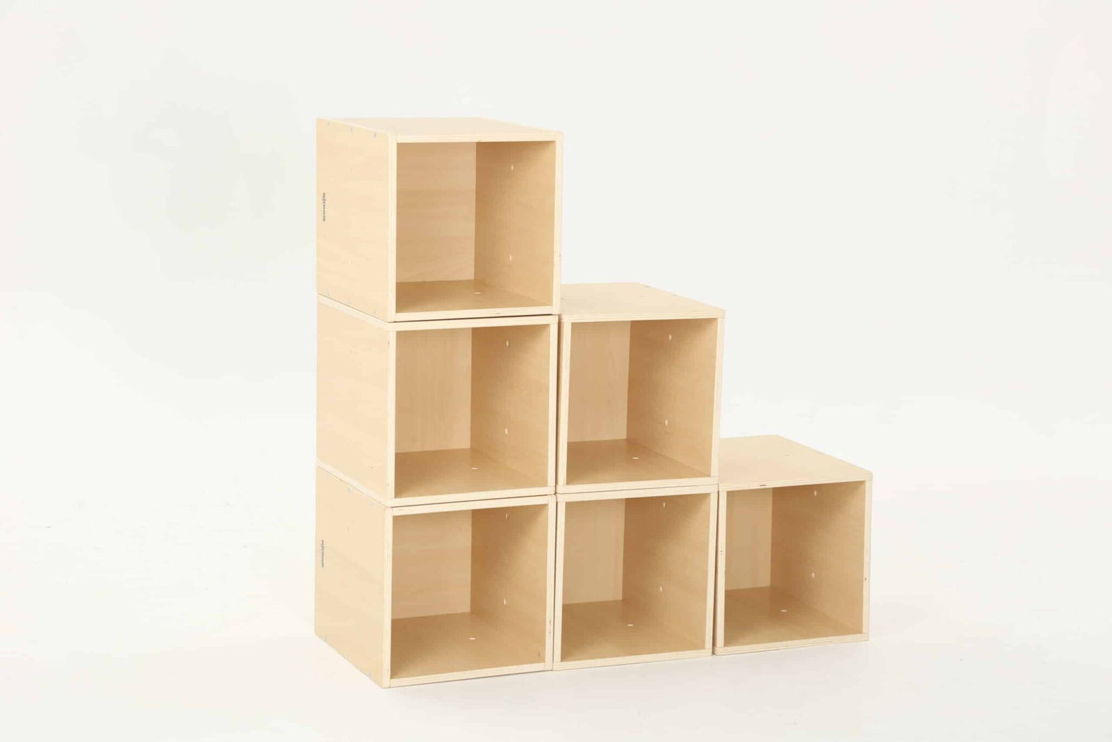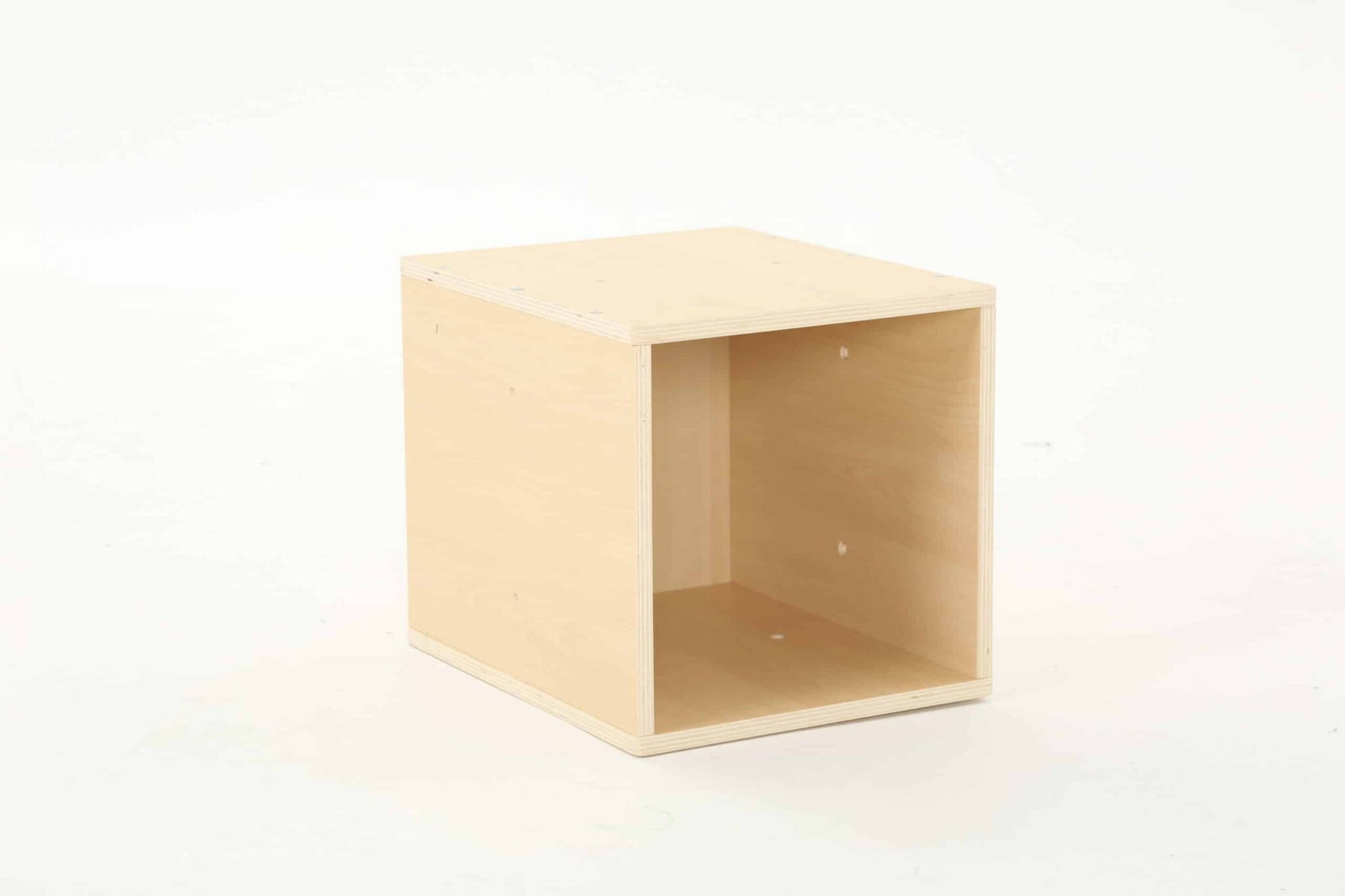 Würfel-Regal zur Einzelnutzung oder in Kombination mit anderen Würfeln. Bei Kombination mehrerer Würfel-Regale, werden die einzelnen Würfel miteinander verschraubt. Schafft reichlich Stauraum unter Treppen und Dachschrägen.