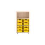 Würfelregal mit 16 kleinen ABS-Boxen unten und 2 Böden, oberes Fach frei für Kitas & Schulen