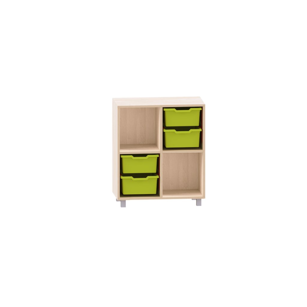 Würfelregal mit 4 großen ABS-Boxen diagonal und einem Boden, restliche Fächer frei für Kitas & Schulen