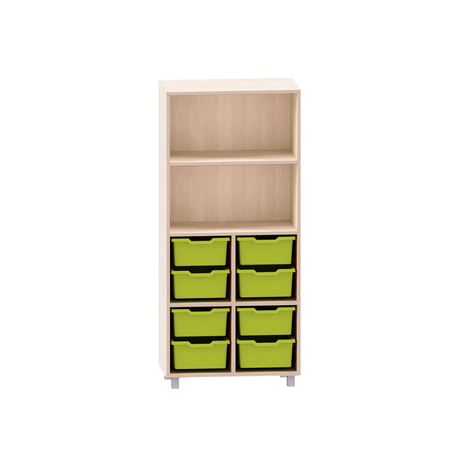 Würfelregal mit 8 großen ABS-Boxen unten und 3 Böden, obere Fächer frei für Kitas & Schulen