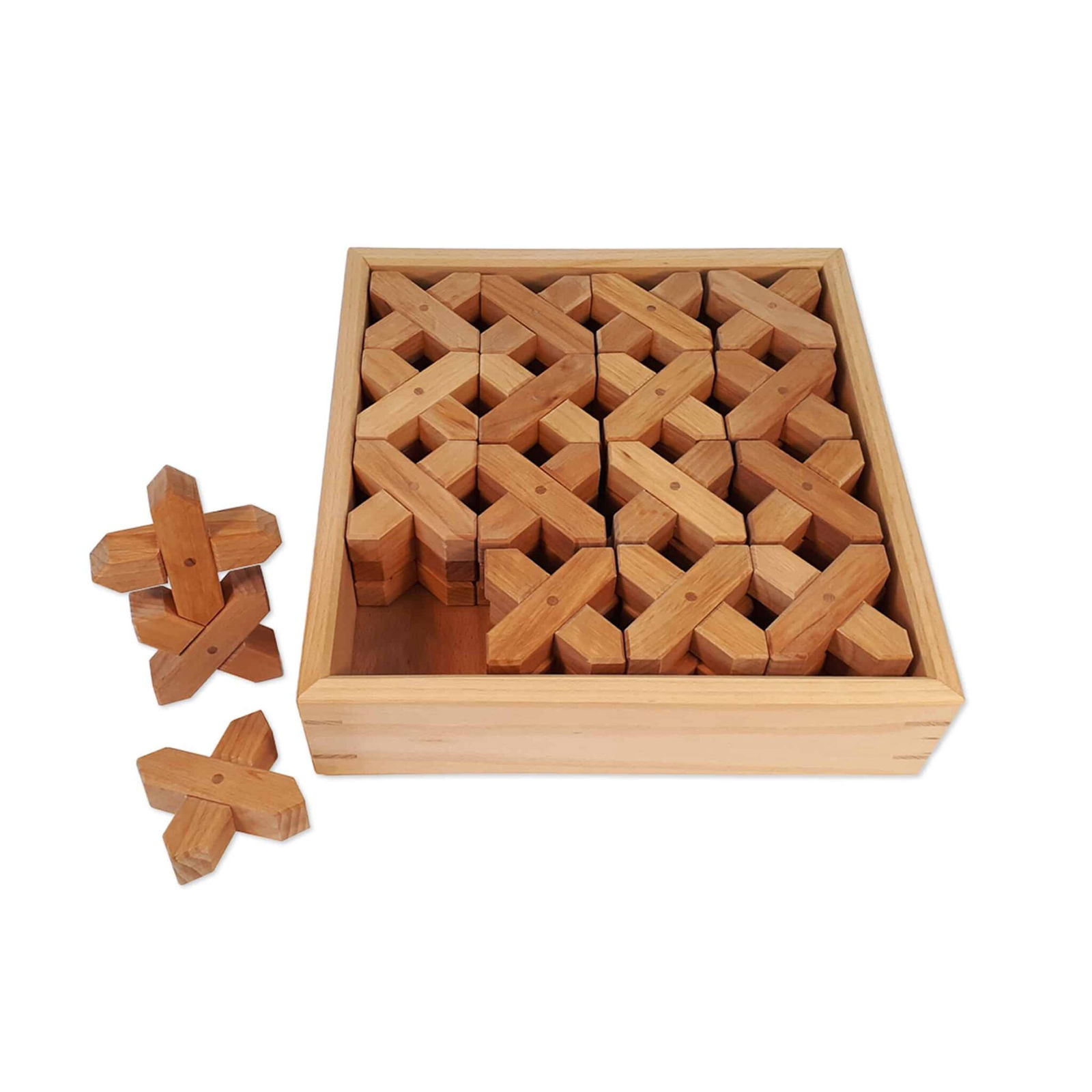 Die X-Klötze haben die Maße von ca. 10 x 10 x 2,5 cm und kommen in einer ansprechenden Holzkiste, die nicht nur die Aufbewahrung erleichtert, sondern auch als dekoratives Element im Spielzimmer dient. Dank ihrer speziellen Form ermöglichen die Klötze unzählige Kombinationen und Konstruktionsmöglichkeiten. Kinder können sie verwenden, um stabile Türme zu bauen, kreative Kunstwerke zu gestalten oder spannende Landschaften zu erschaffen.