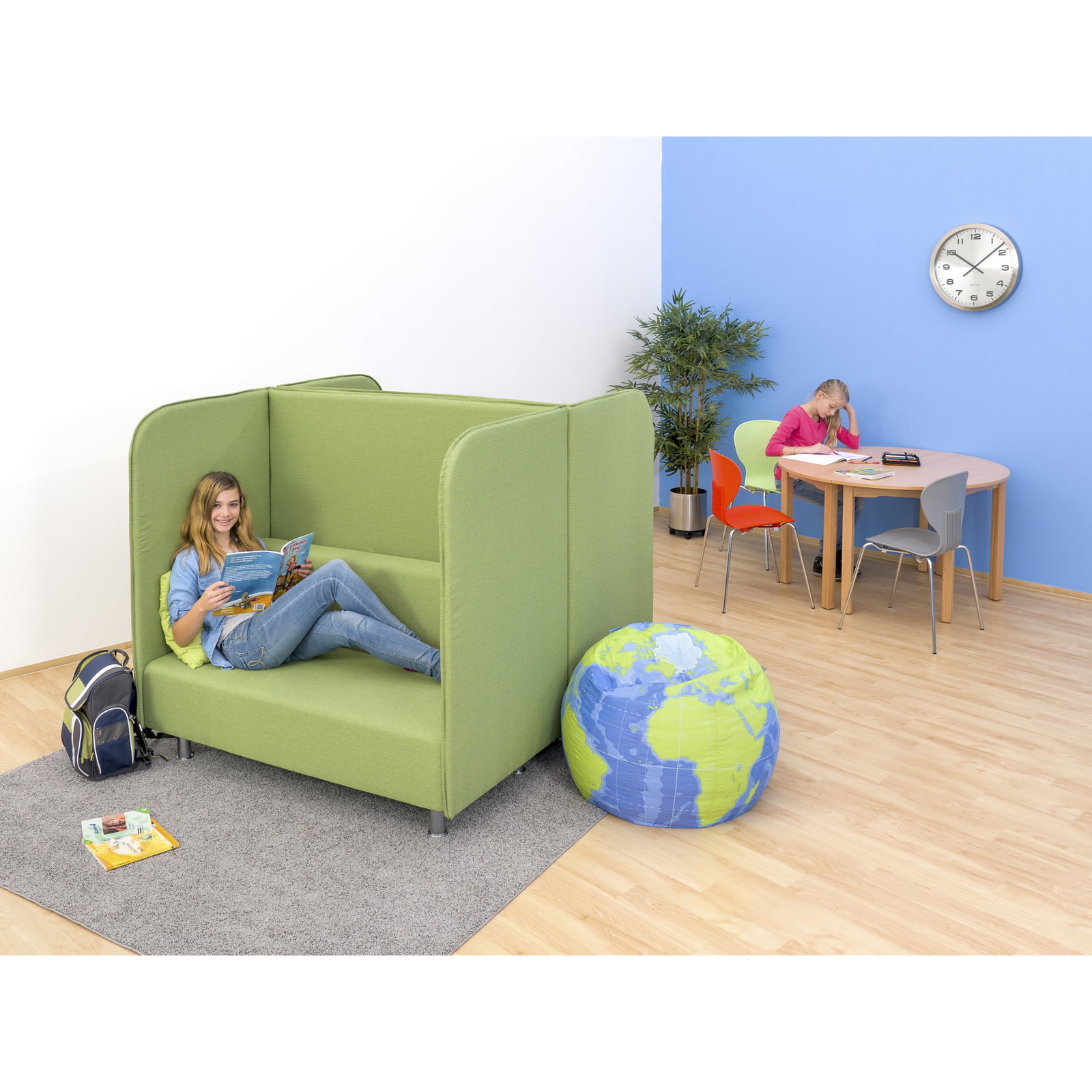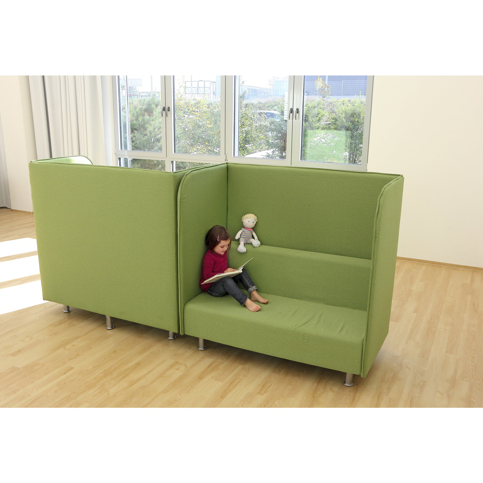 Die hohe, abgerundete Rückenlehne fungiert als akustische Barriere, die den Umgebungslärm deutlich reduziert. So entsteht eine geschützte Nische, in der sich Kinder gemeinsam entspannen und konzentrieren können. Das Sofa dient gleichzeitig als eleganter Raumteiler, der große Räume strukturiert und Zonen für unterschiedliche Aktivitäten schafft. - Ergonomischer Komfort für verschiedene Altersgruppen