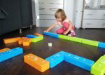 - Inhalt: 30 farbige Kunststoff-Bausteine (20 × 4,4 × 6,3 cm) und ein Farbwürfel