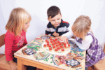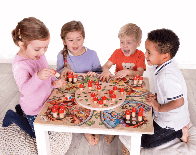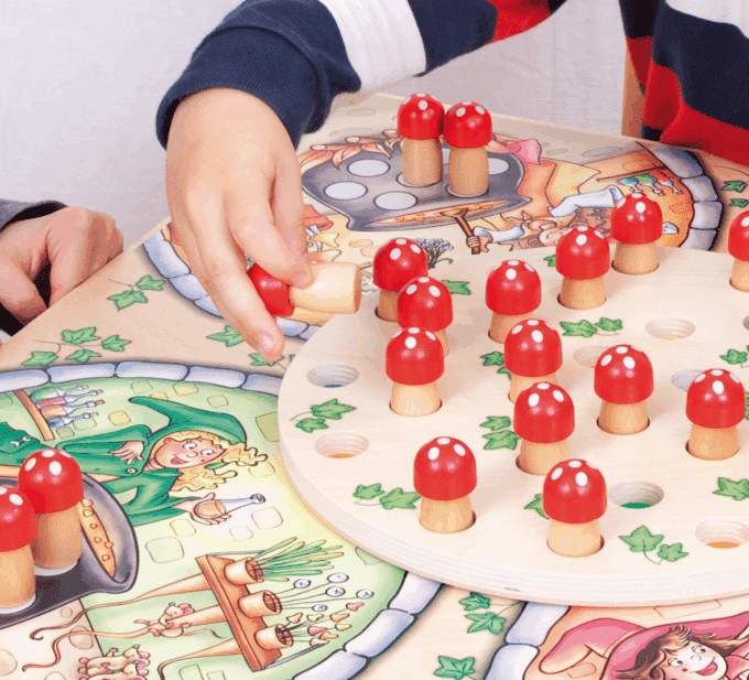 - Sucht unter den extra großen Holzpilzen, um die farbigen Punkte zu finden, die mit den Farben auf dem Würfel übereinstimmen.