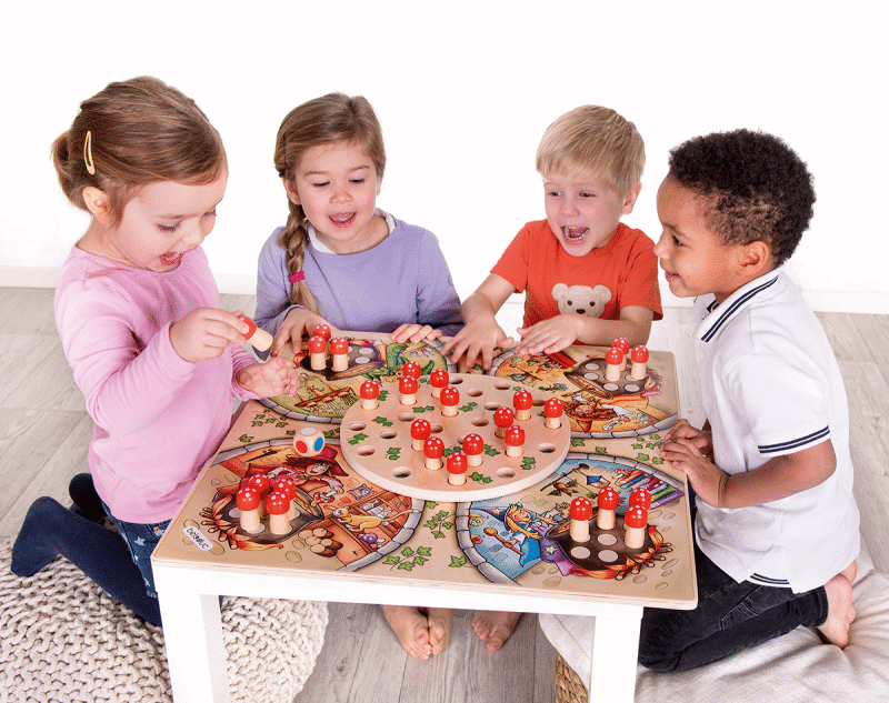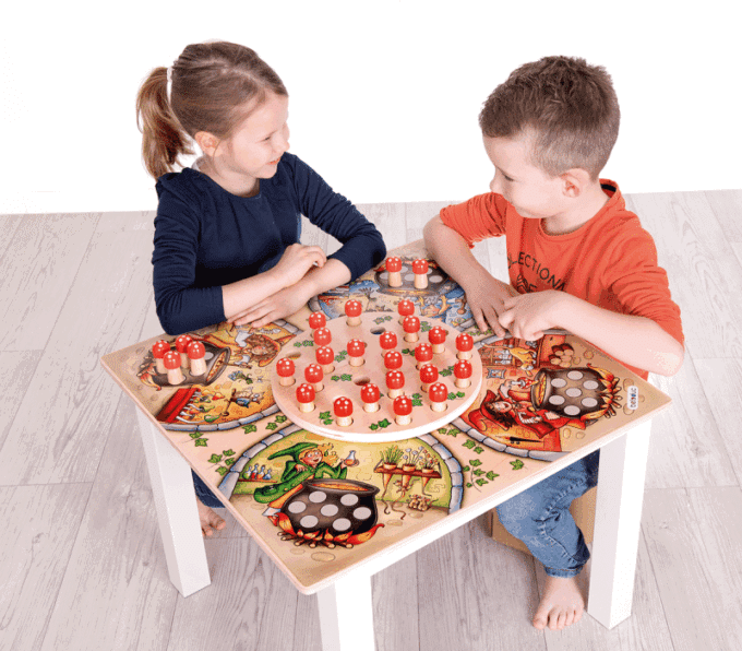 - Wettstreit der Hexenküchen-Talente: Vier angehende Hexenmeister wetteifern darum, wer als Erster die korrekten Pilze für seinen Zaubertrank zusammenhat – nur Pilze mit der auf dem Würfel angezeigten Farbe landen im Hexentopf.
