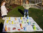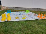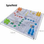 - Inhalt: 1 Spielfeld (150 × 150 cm), 16 Spielfiguren, 1 extra großer Würfel, 4 Heringe