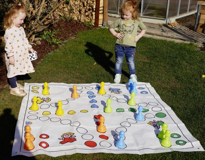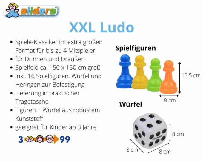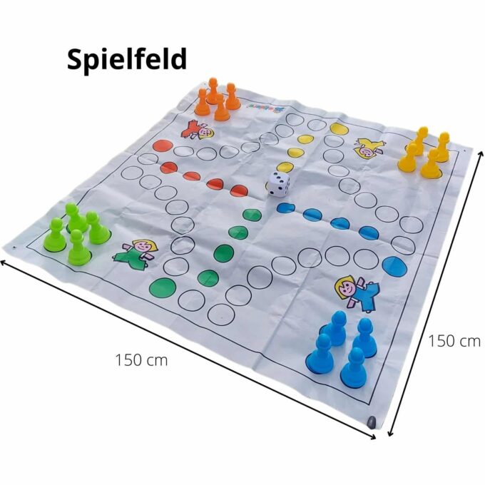 XXL Ludo – Riesiger Spielspaß für die ganze Familie: Erleben Sie das klassische Strategiespiel Ludo in einer völlig neuen Dimension! Unser XXL Ludo bringt doppelten Spielspaß für die ganze Familie, egal ob drinnen oder draußen. Wer bringt als Erstes seine vier Spielfiguren ins Ziel?