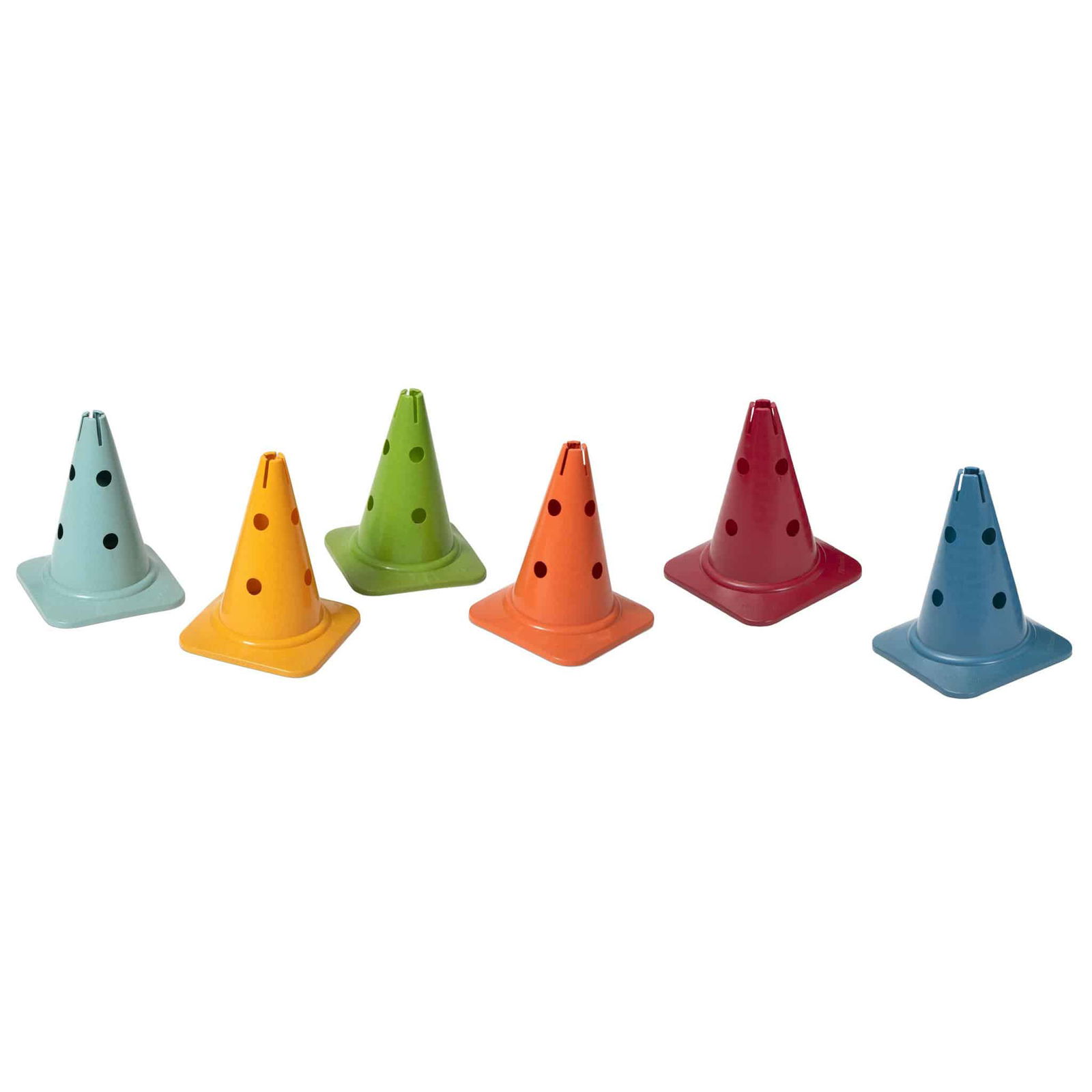 - 6 Kegel aus treeNside-Material (Farben: Coral, Curry, Türkis, Grün, Blau, Rot)