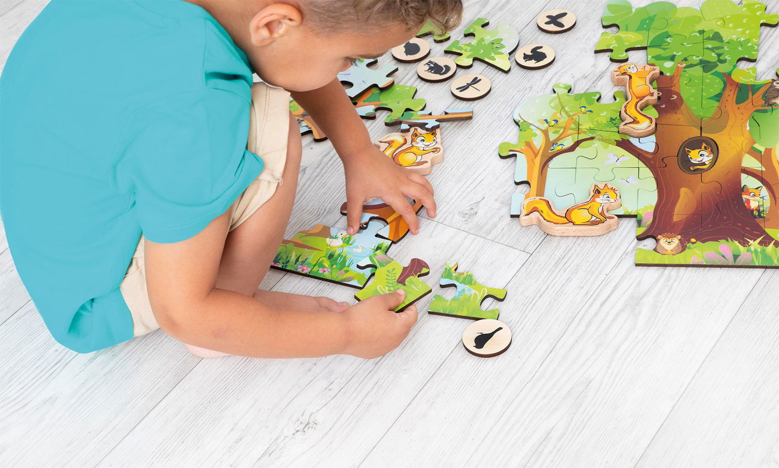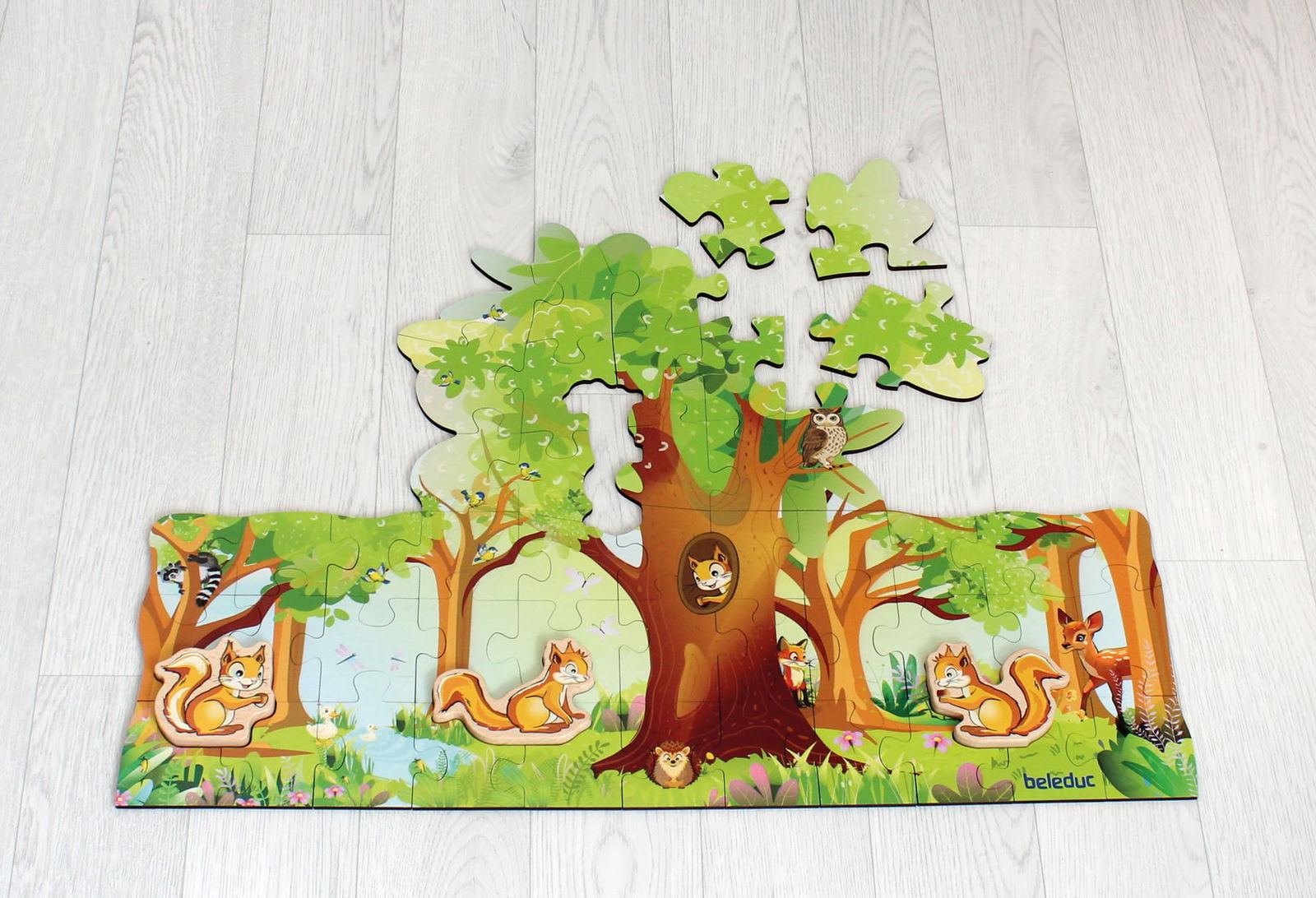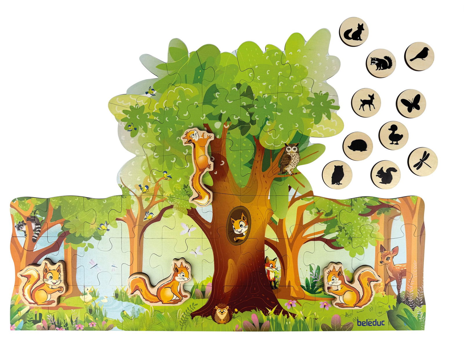 - Interaktives Spielfeld: Nach dem Puzzeln wird die Szenerie zur Kulisse für fantasievolle Geschichten. Die vier niedlichen Eichhörnchen-Figuren aus Holz können aufgestellt und im Wald bewegt werden.