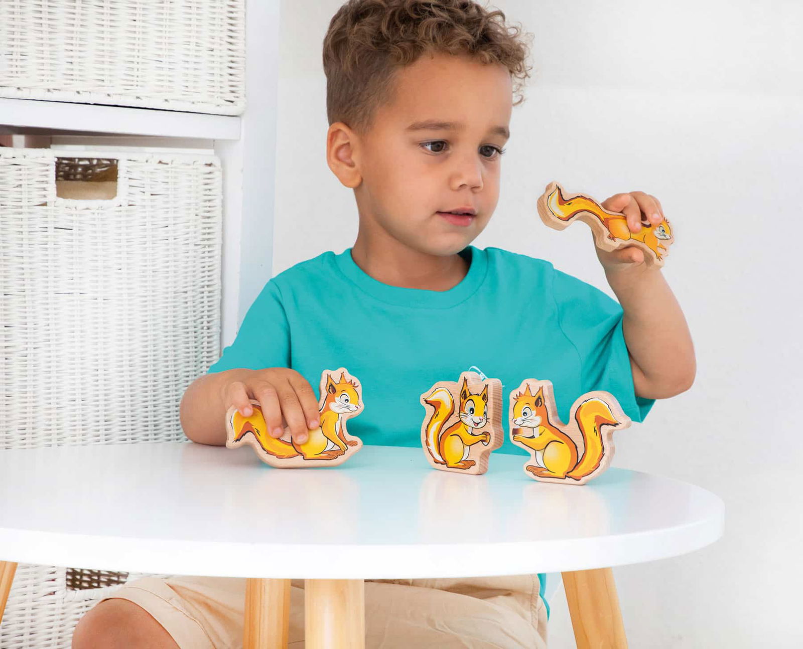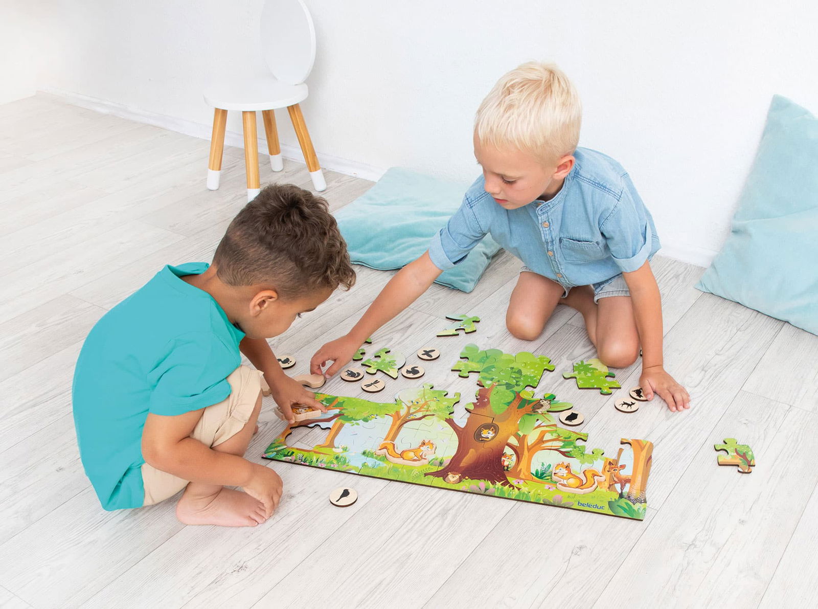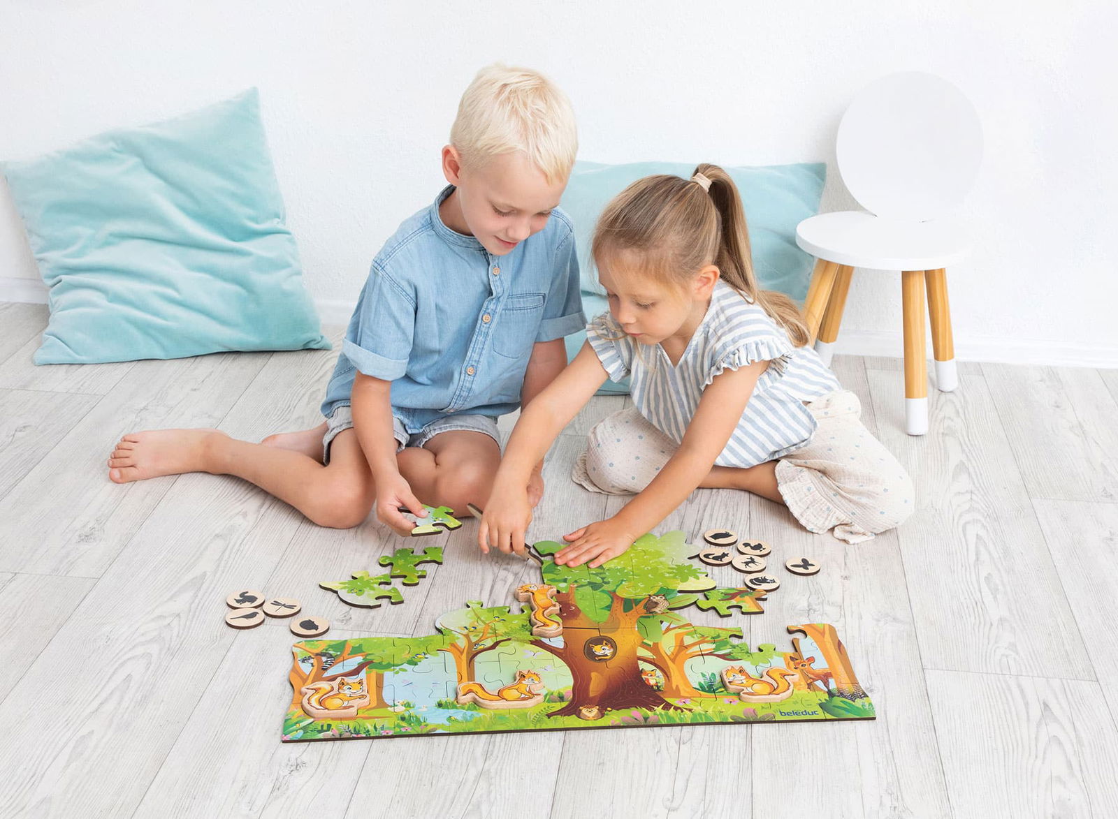 - Interaktives Spielfeld: Nach dem Puzzeln wird die Szenerie zur Kulisse für fantasievolle Geschichten. Die vier niedlichen Eichhörnchen-Figuren aus Holz können aufgestellt und im Wald bewegt werden.