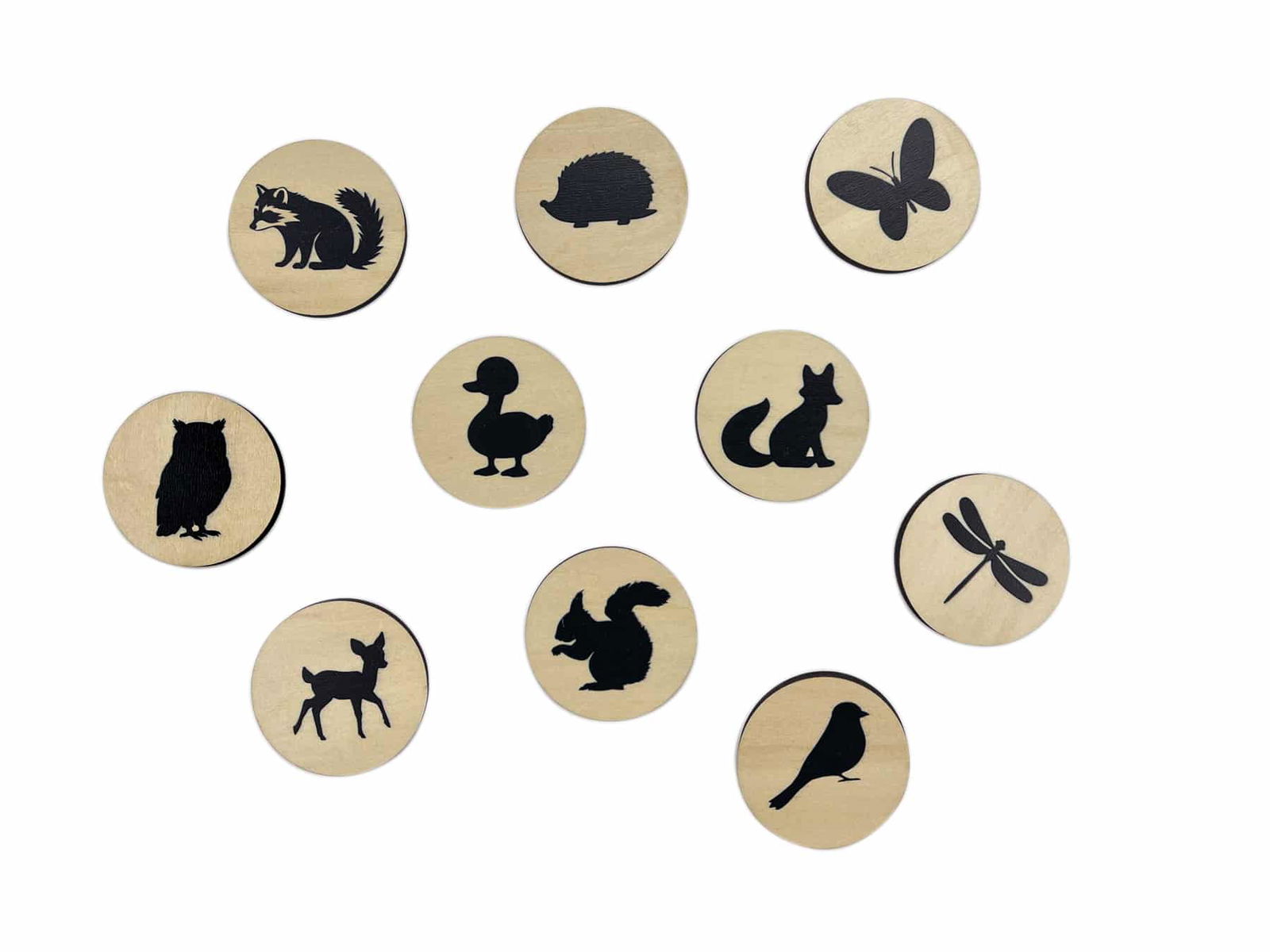 - 10 runde Tierchips aus Holz für das Suchspiel