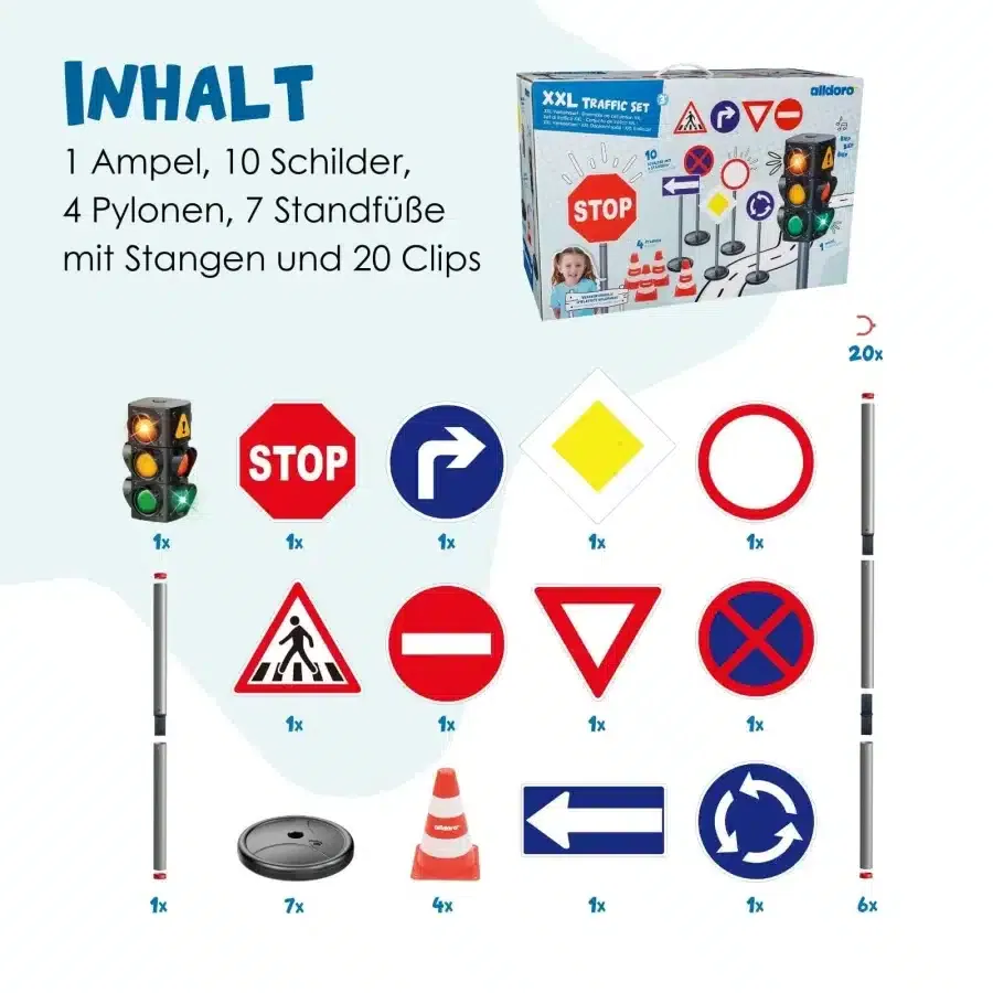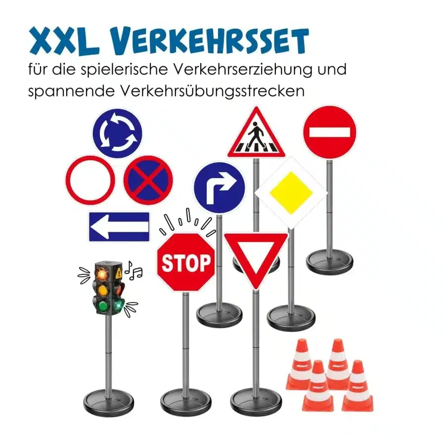 Grünes Licht für sicheres Lernen! Mit unserem XXL-Verkehrsset verwandelt sich jedes Kinderzimmer, jeder Garten und jeder Schulhof in eine realistische Verkehrsübungsstrecke. Dieses umfassende Set wurde entwickelt, um Kindern ab 3 Jahren spielerisch und anschaulich die wichtigsten Regeln des Straßenverkehrs beizubringen. Bestehend aus einer großen, batteriebetriebenen Ampel mit Licht- und Soundfunktion, 10 originalgetreuen Verkehrszeichen und vier vielseitigen Pylonen, bietet es alles, was kleine Verkehrsteilnehmer für ihre ersten sicheren Schritte benötigen. Bereiten Sie Ihr Kind auf unterhaltsame Weise auf den Straßenverkehr vor und fördern Sie spielerisch Verantwortungsbewusstsein und Sicherheit.