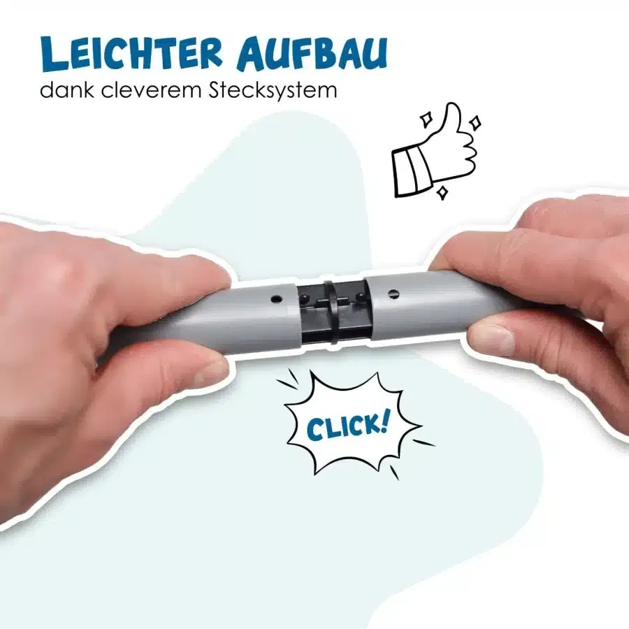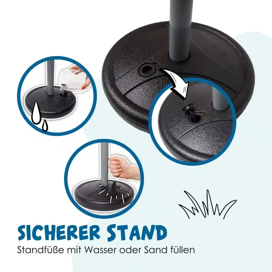 - Stabilität: Standfüße mit Wasser oder Sand befüllbar