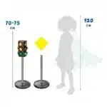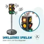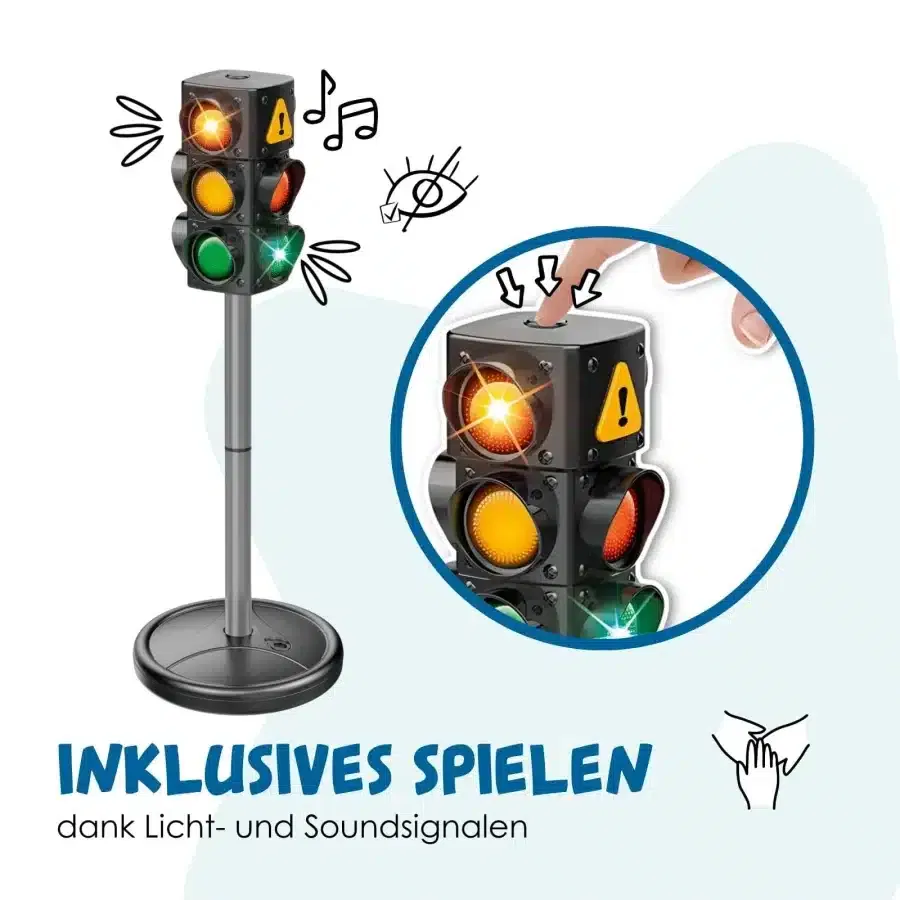 - Realistisches und interaktives Lernerlebnis: Kinder lernen am besten durch Nachahmung. Die 70 cm hohe Ampel mit ihren automatisch oder manuell wechselnden Lichtphasen und authentischen Soundeffekten fesselt die Aufmerksamkeit und macht das Erlernen von Warte- und Gehzeiten zu einem spannenden Spiel. Die 10 großen, beidseitig nutzbaren Verkehrszeichen (von Stoppschild bis Zebrastreifen) vermitteln anschaulich die wichtigsten Regeln und fördern das Situationsbewusstsein.