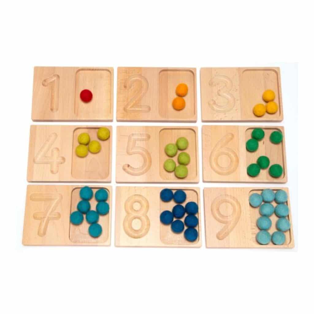 Zahlen entdecken, Mengen begreifen und Feinmotorik spielerisch fördern Die Zahlenfelder zum Nachspuren und Legen sind die ideale Lernhilfe für Kinder, die erste Schritte in die Welt der Zahlen machen. Das hochwertig verarbeitete Set aus massivem Buchenholz besteht aus neun handlichen Zahlenbrettchen mit Vertiefungen, die für ein interaktives und multisensorisches Lernerlebnis sorgen. Kinder können die Form der Zahlen nachspuren und dabei ihre Feinmotorik gezielt trainieren. Ob mit den Fingern, einem Stab oder befüllt mit Materialien wie Sand oder Perlen – die Zahlen lassen sich auf vielfältige Weise entdecken.