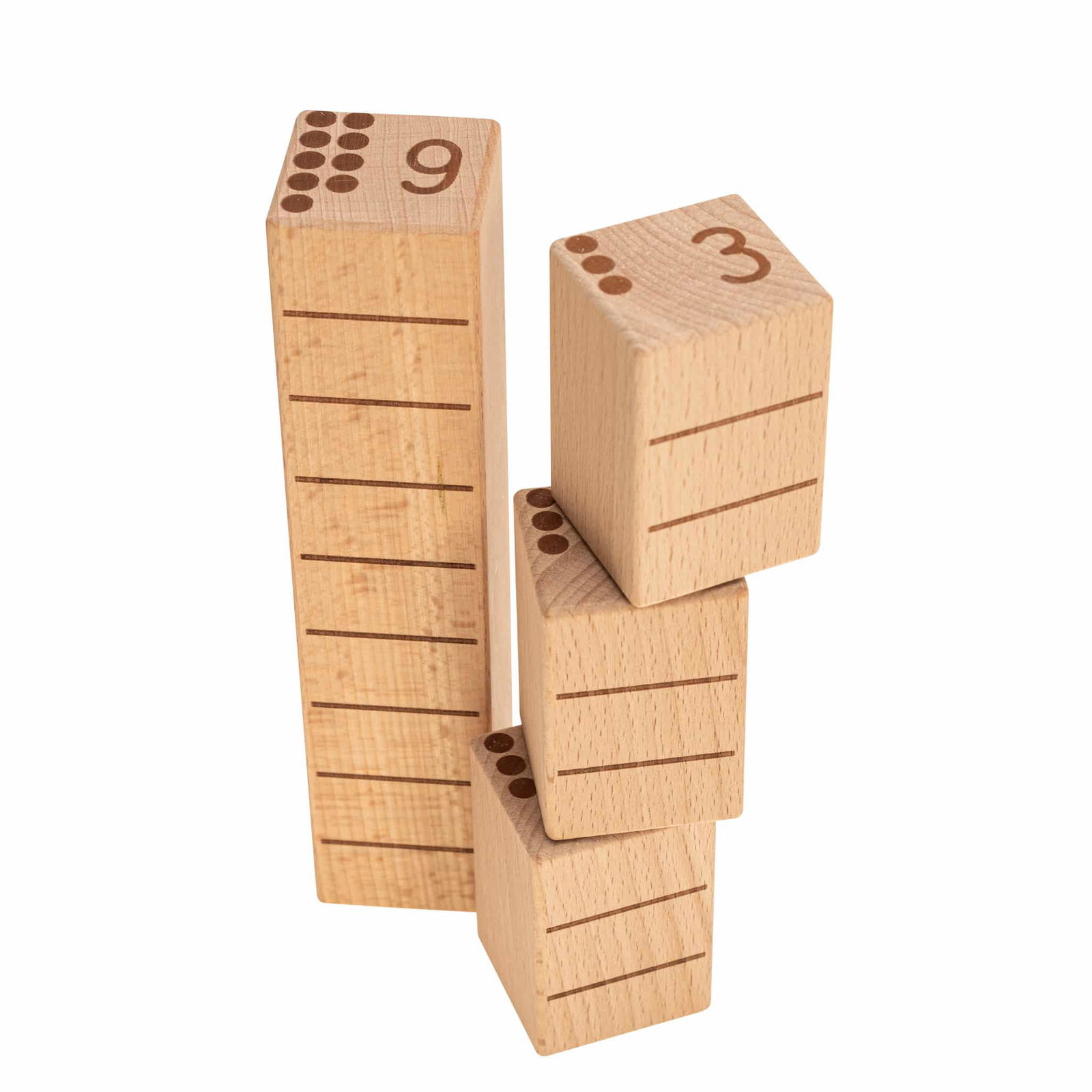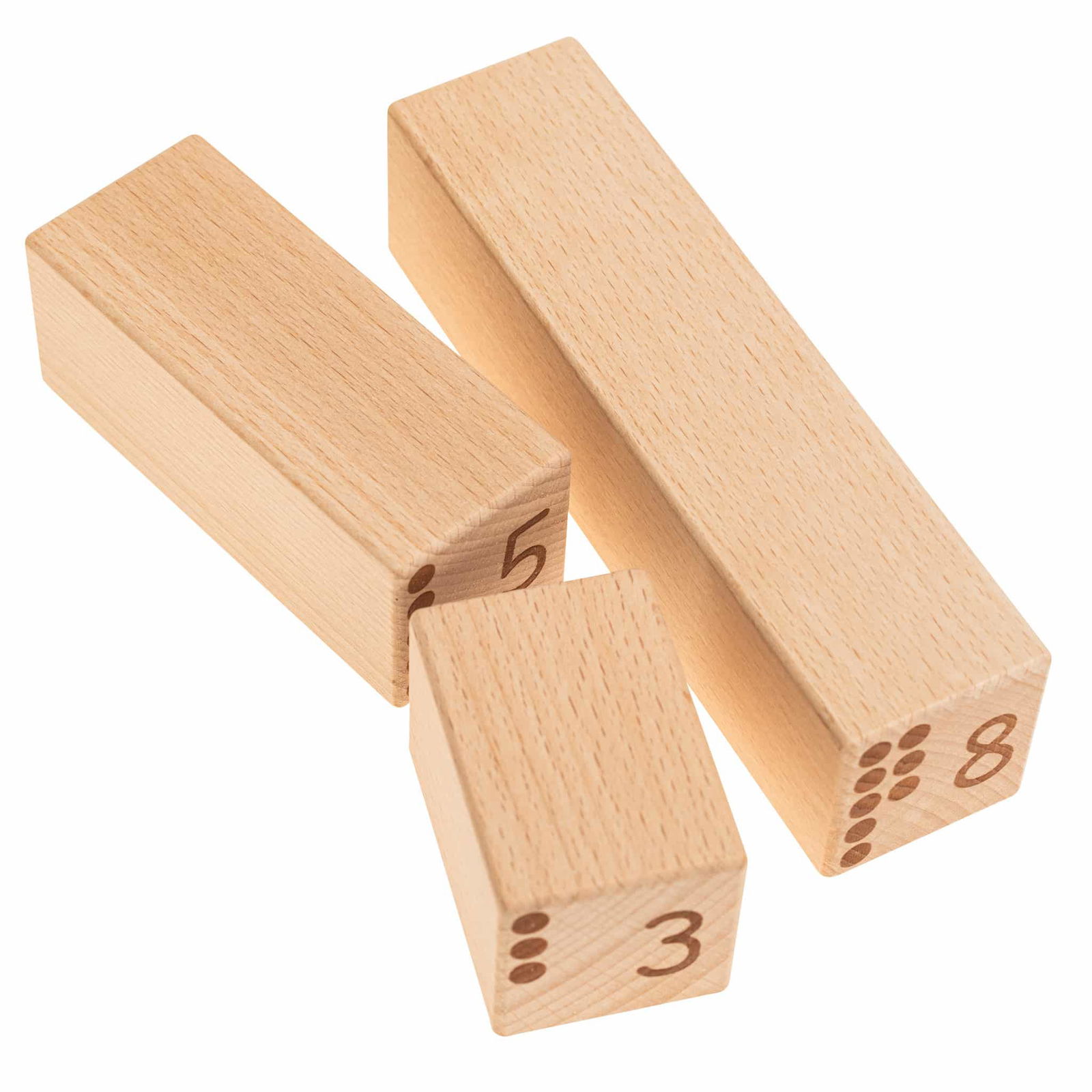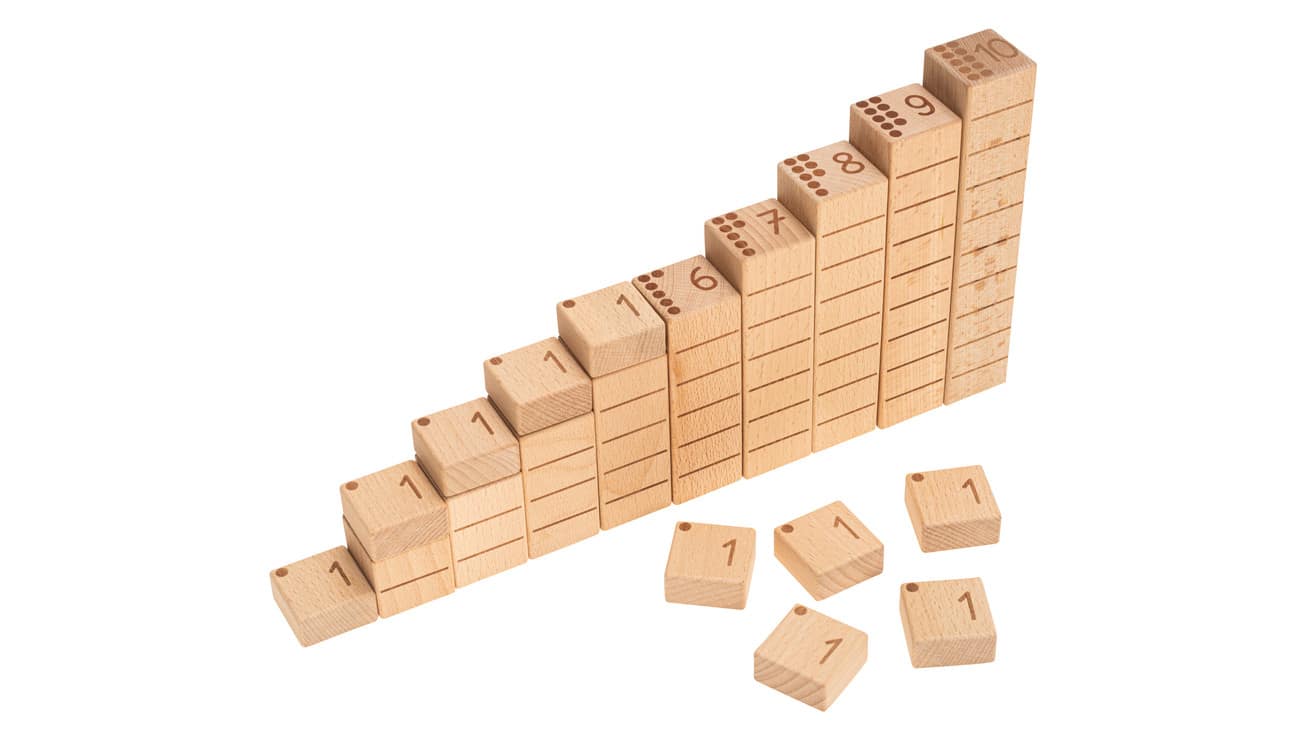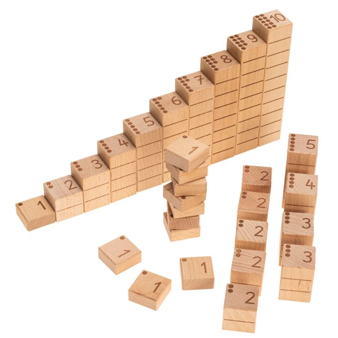 Die Zähl- und Zahlenbausteine bestehen aus hochwertigem Buchenholz und sind in verschiedenen Größen designed. Die Höhe jedes Bausteins entspricht seinem Zahlenwert, was den Kindern hilft, die Beziehung zwischen Zahl und Menge zu begreifen. Zum Beispiel ist ein 2er-Baustein und ein 3er-Baustein zusammen so hoch wie ein 5er-Baustein. Dieses anschauliche Prinzip bietet eine klare, visuelle Hilfestellung, um mathematische Konzepte wie Addition und Subtraktion zu verstehen.