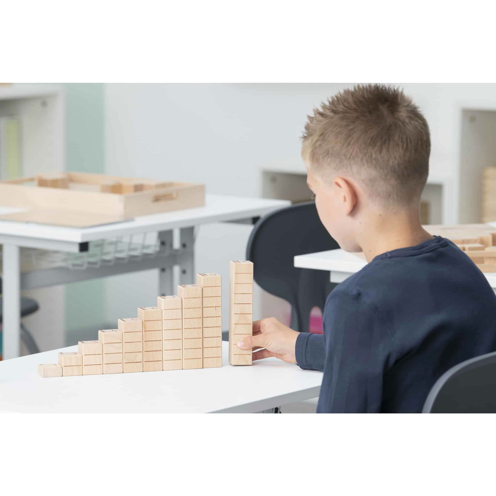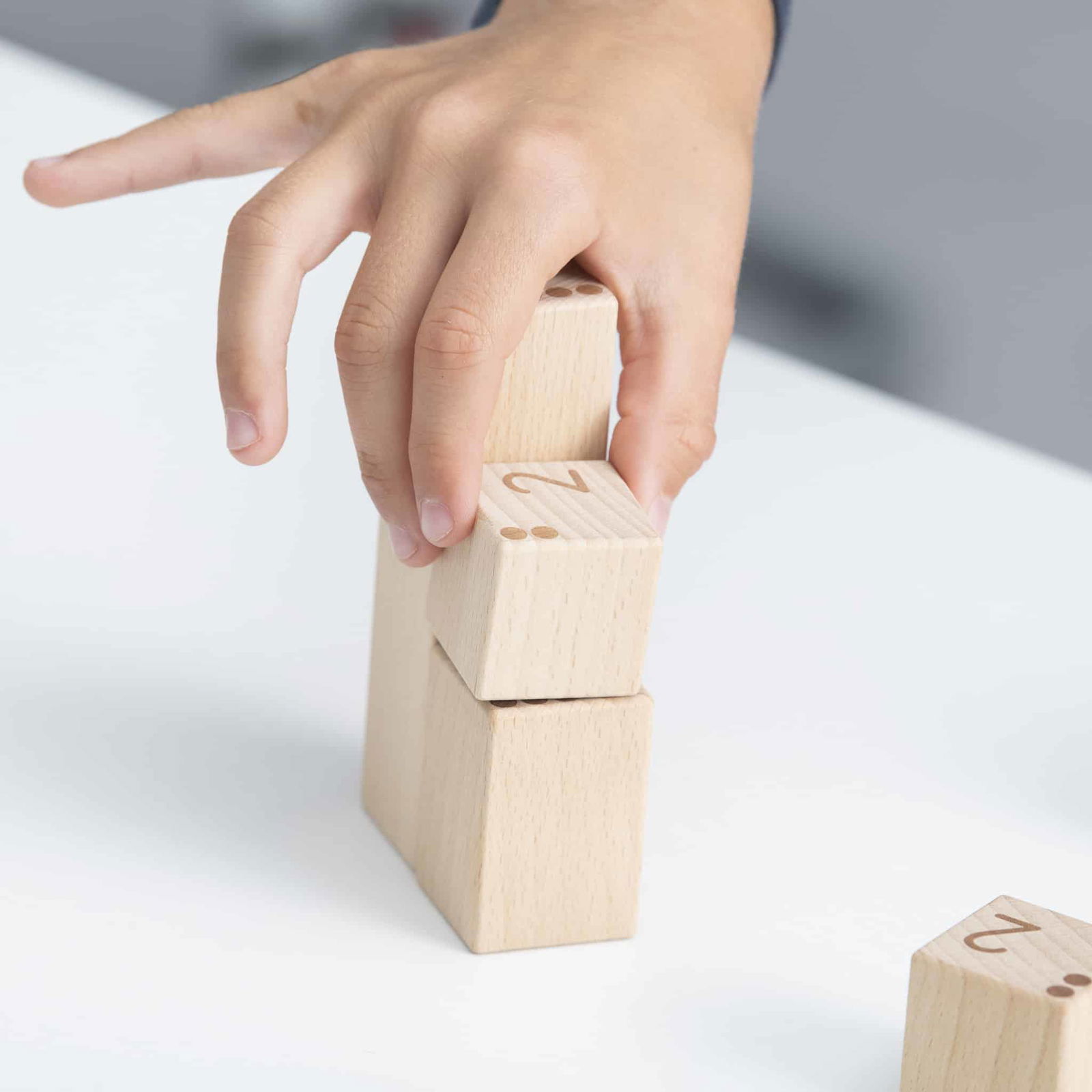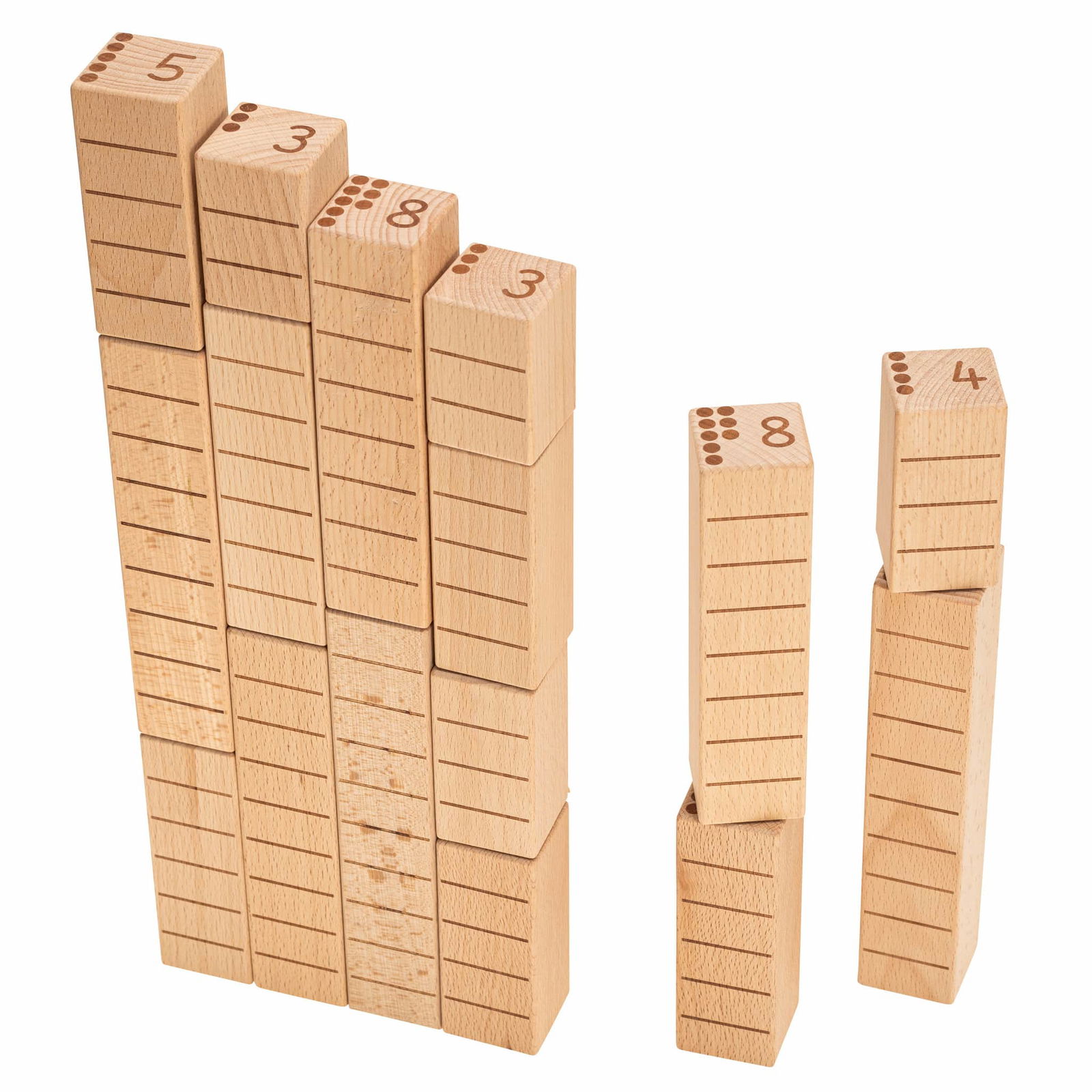 Die Zähl- und Zahlenbausteine bestehen aus hochwertigem Buchenholz und sind in verschiedenen Größen designed. Die Höhe jedes Bausteins entspricht seinem Zahlenwert, was den Kindern hilft, die Beziehung zwischen Zahl und Menge zu begreifen. Zum Beispiel ist ein 2er-Baustein und ein 3er-Baustein zusammen so hoch wie ein 5er-Baustein. Dieses anschauliche Prinzip bietet eine klare, visuelle Hilfestellung, um mathematische Konzepte wie Addition und Subtraktion zu verstehen.