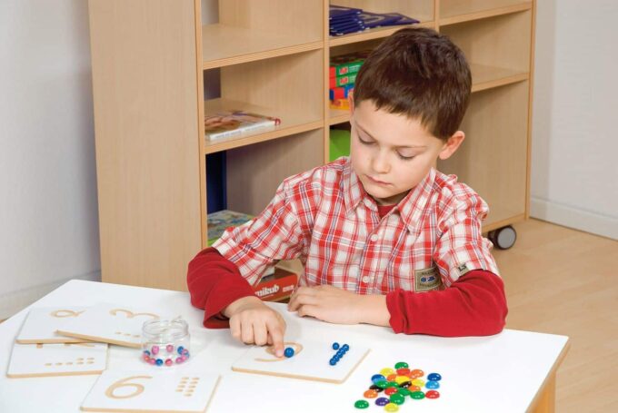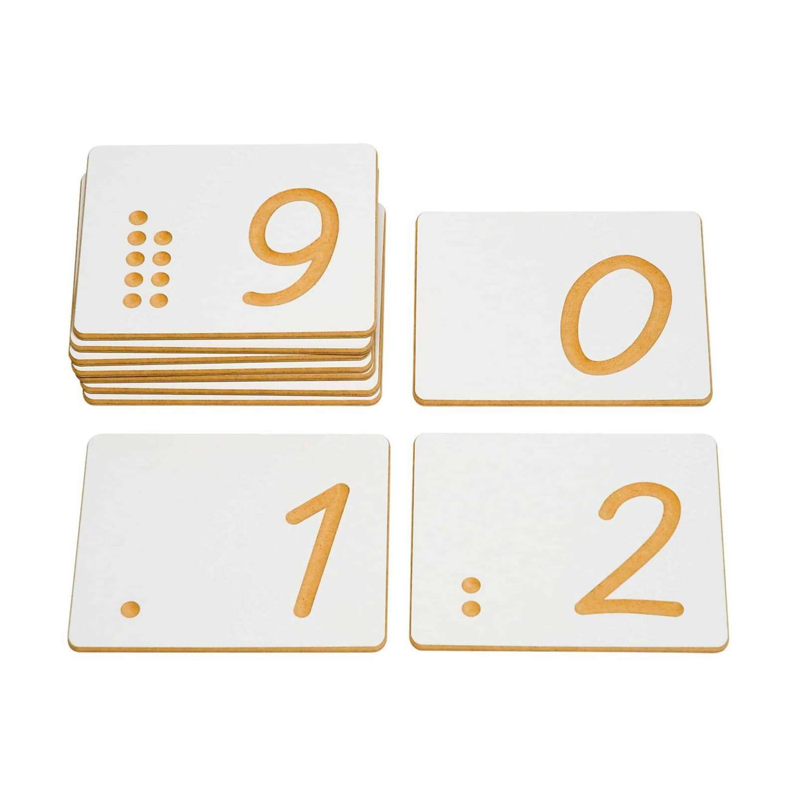 Die Platten sind so gestaltet, dass die Zahlen und Punktmengen in rinnenförmigen Vertiefungen abgebildet sind, die es den Kindern ermöglichen, die Zahlen nicht nur visuell, sondern auch durch Ertasten und Fühlen zu erfahren. Mit geschlossenen Augen können die Kinder die Ziffern erfühlen, was ihr haptisches Lernen intensiviert und ihren Tastsinn schult. Durch das Ertasten der jeweiligen Punktemenge lernen sie, das Konzept der Mengen zu verstehen, und ermöglichen sich selbst eine praktische Fehlerkontrolle.