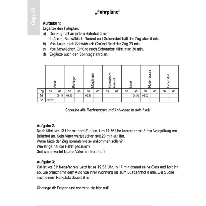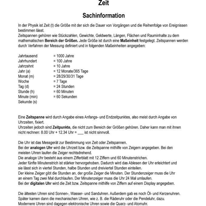 - Sachaufgaben: Anwendungsnahe Aufgaben zur Berechnung von Zeiten und deren Einschätzung.