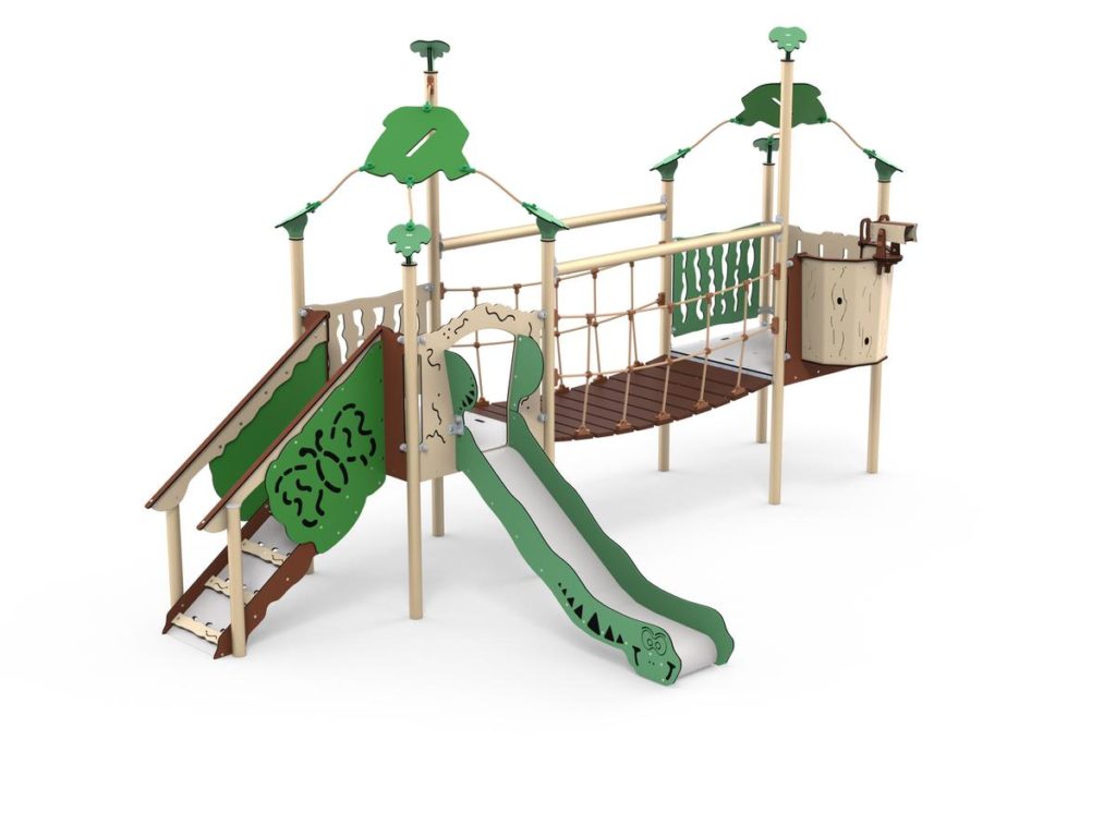 LEDON Explore bietet mehrere verschiedene Hängebrücken für unterschiedliche Altersgruppen. Die Spielanlage Sikan ist für die Jüngsten gedacht. Deshalb hat diese Hängebrücke einen festen Boden, sodass die Brücke nur leicht schwingt und die Kinder sicher stehen können.