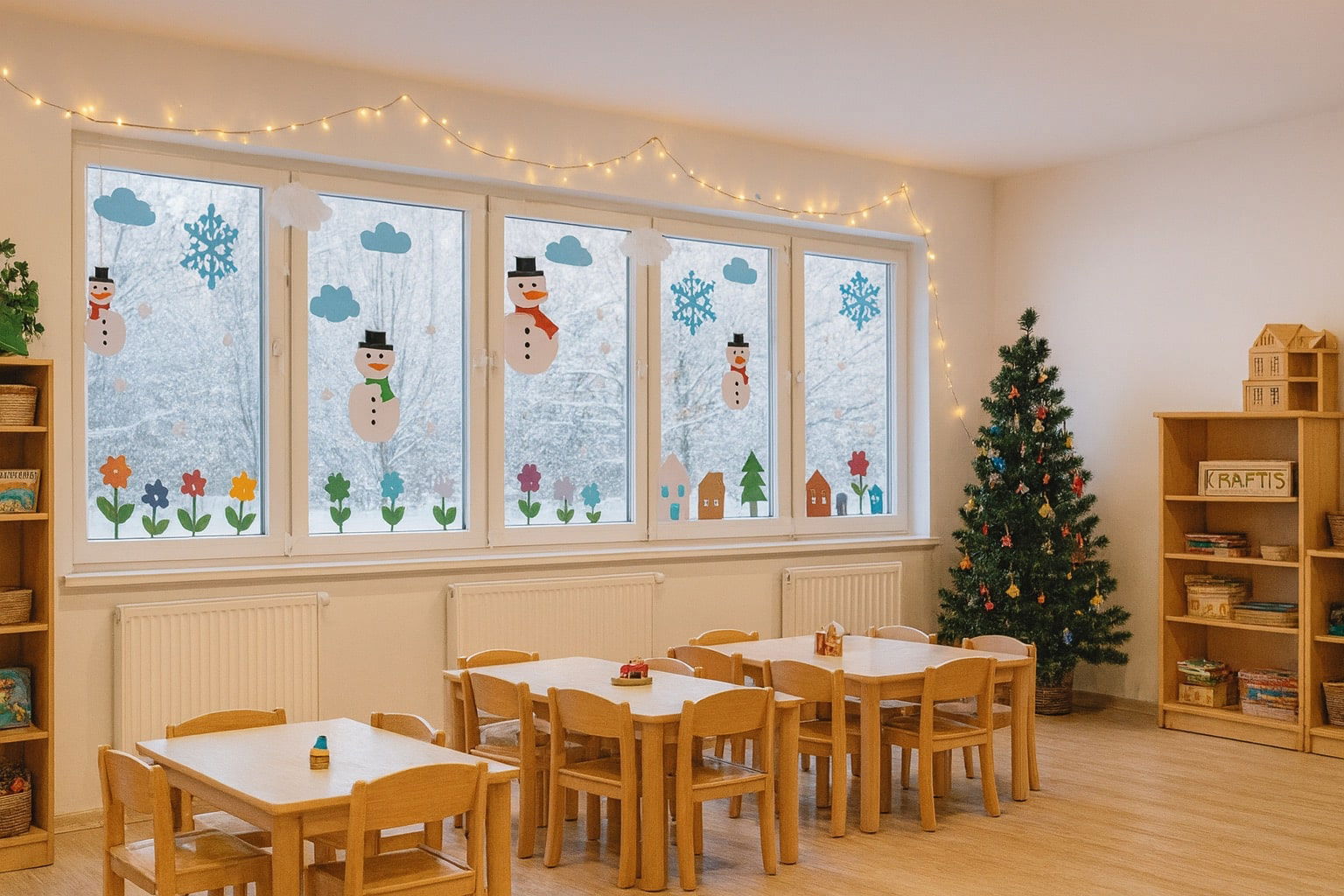 Der Gruppenraum ist der Ort, an dem die Kinder spielen, kreativ arbeiten, sich ausruhen, Geschichten hören und jeden Tag kleine Winterwunder erleben. Gerade im Winter ist es besonders wichtig, hier eine Atmosphäre der Wärme und Sicherheit zu schaffen – eine Art „zweites Zuhause“, in dem man sich entspannen, spielen und wohlfühlen kann.