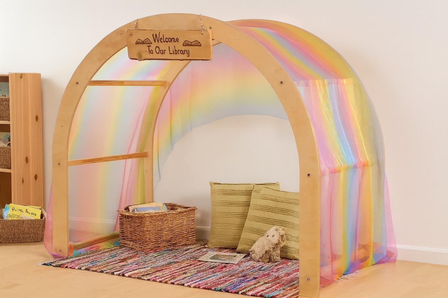 - Gemütliche Rückzugsorte. Das sind kleine „stille Häfen“ im Raum: überdachte Höhlen, Spielhäuschen zum Kuscheln, weiche „Bärenhöhlen“. Sie schaffen ein Gefühl von Sicherheit und ermöglichen es den Kindern, sich vom Lärm zurückzuziehen, zu entspannen, ein Buch zu lesen oder in Ruhe zu spielen – solche Zonen werden im Winter zu wahren Inseln des emotionalen Wohlbefindens.